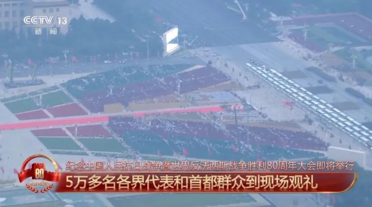 今天,數(shù)十位國際政要應(yīng)邀來華蒞臨現(xiàn)場,各界代表和首都群眾在長安街南北兩側(cè)現(xiàn)場近距離觀禮。從空中可以清晰地看到,廣場上觀禮區(qū)的布局呈現(xiàn)出三個(gè)“人”字,構(gòu)成了意象化的“眾”字,體現(xiàn)了眾志成城的意涵。